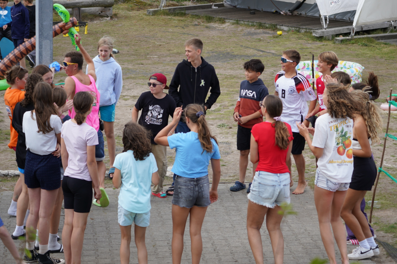Der Tag begann um 7:30 Uhr mit lauter Musik. Nach dem Zähneputzen und dem Aufräumen der Zelte ging es zum Frühstück, bei dem es leckere Brötchen und verschiedene Aufstriche gab. Anschließend mussten alle ihre Dienste erledigen; an diesem Tag hatten wir Mülldienst bei Wolle. Zum Mittagessen gab es das Vesper, das wir uns bereits beim Frühstück vorbereitet hatten. Gestärkt machten wir uns danach auf den Weg zum Strand, wo sich einige Mutige ins kalte Wasser wagten. Anschließend liefen wir zeltweise durch das Dorf zurück ins Lager. Nach einer heißen Dusche folgte etwas Freizeit, die wir mit Volleyballspielen verbrachten. Zum Abendessen wurden leckere Maultaschen mit Kartoffelsalat serviert. Im Anschluss begann das Abendprogramm: Die Betreuer hatten eine „Totto-Lotto-Party“ vorbereitet, bei der immer zwei Zelte gegeneinander in verschiedenen Challenges antreten mussten. Nach diesem aufregenden Tag ging es schließlich ins Bett. Spoiler: In dieser Nacht schliefen nicht alle Zelte …