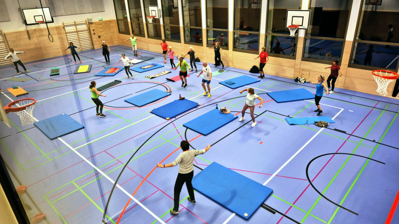 Eine große Glasfensterfront zum Postweg, eine helle LED-Beleuchtung, ein spezieller Sportboden zeichnen die neue Halle aus