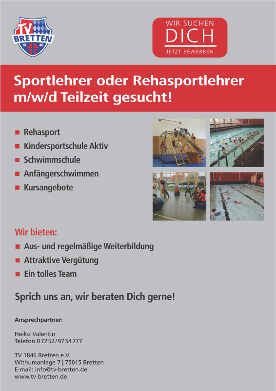 Nähere Informationen erhältst Du in der Geschäftsstelle von Heiko Valentin & Sabine Schönbeck unter Tel. +49 (0) 7252 / 9754777 oder info@tv-bretten.de.